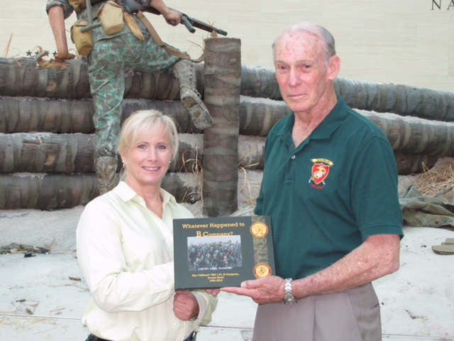 Book Copies Sent and Acknowledged Andy Vaart received a letter of acknowledgement and thanks for a copy of the Cruise Book sent to the Library of Congress. Click here for a copy of the letter Andy also received a thank you letter for a gift copy of the Cruise Book from Lin Ezell, the director of the National Museum of the Marine Corps. And Andy got a letter from the Vietnam Center and Archive at Texas Tech University acknowledging a copy of the Cruise Book. Finally, Andy & Mike Wholley got nice "thank you" notes from LtGen Mark Faulkner, president of the Marine Copr Association. Copies were also sent to University of North Carolina and the Piedmont NROTC consortium. A Thank-You Copy! The Photo below is the August 4, 2017 presentation of the B Company cruise book by Hays Parks to Sharon Hughes, Executive Assistant to LTGen. Robert R. Blackman, Jr., USMC (Ret.), President and CEO, Marine Corps Heritage Foundation, in gratitude for her advice, assistance and support leading to installation of B Co. TBS 1-67 memorial plaque on the grounds of the Marine Corps Heritage Center, Semper Fidelis Memorial Park.